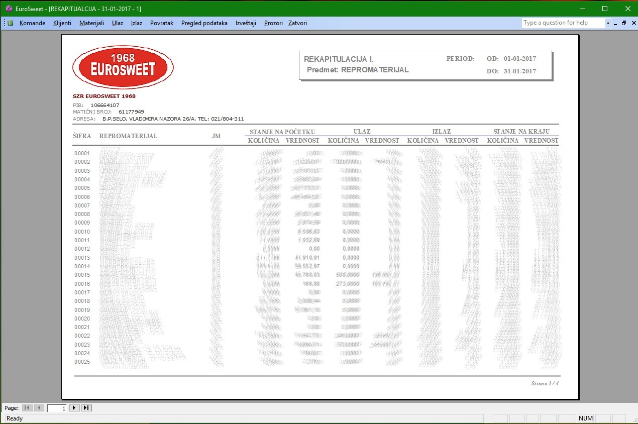 Osnovne funkcije: - Evidencija repromaterijala - Evidencija proizvoda - Evidencija kupaca i dobavljača - Prijemnice - Radni nalog - Karton repromaterijala, proizvoda - Mesečna rekapitulacija - Ulazni računi - Izlazni računi - Rekapitulacija poreza - Odbitak - Cenovnik - Inventar - Receptura |