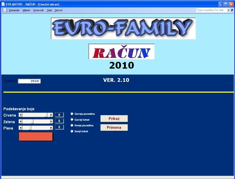 Datum puštanja u rad: 01.01.2008.Korisnik: EUROFAMILY - Bačko Petrovo Selo Osnovne funkcije: - Evidencija proizvoda- Evidencija kupaca i dobavljača- Gotovinski račun- Izlazni računi- Cenovnik